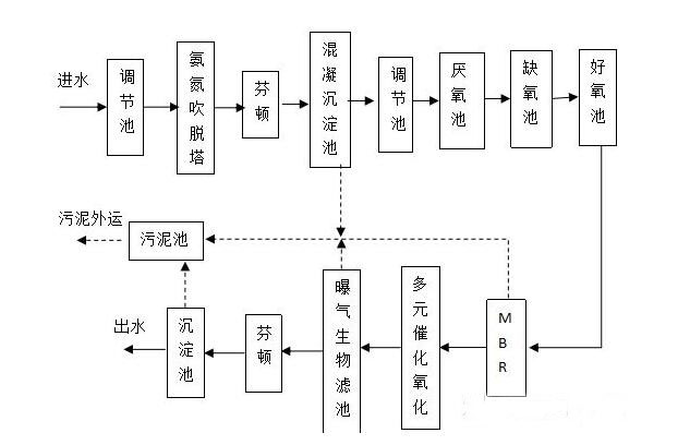 污水處理解決氨氮超標(biāo)方法新的技術(shù)不斷出現(xiàn),在處理氨氮廢水的應(yīng)用方面展現(xiàn)出誘人的前景。本文側(cè)重介紹吹脫法處理高濃度氨氮廢水的技術(shù)特點及研究應(yīng)用。污水處理解決氨氮超標(biāo)方法本次采用:吹脫法+生物法采用吹脫——缺氧——兩級好氧工藝處理垃圾滲濾液,其中氨氮含量達1500mg/L,COD濃度。為4000~5000mg/L。選定pH值為9.8,吹脫時問12h,經(jīng)吹脫后氨氮去除率為60%,經(jīng)生化處理后氨氮去除率達95%,同時取得90%以上的COD去除效果。某工廠采用吹脫法與生物法相結(jié)合處理垃圾滲濾液取得了成功的效果,其工藝流程如圖所示。